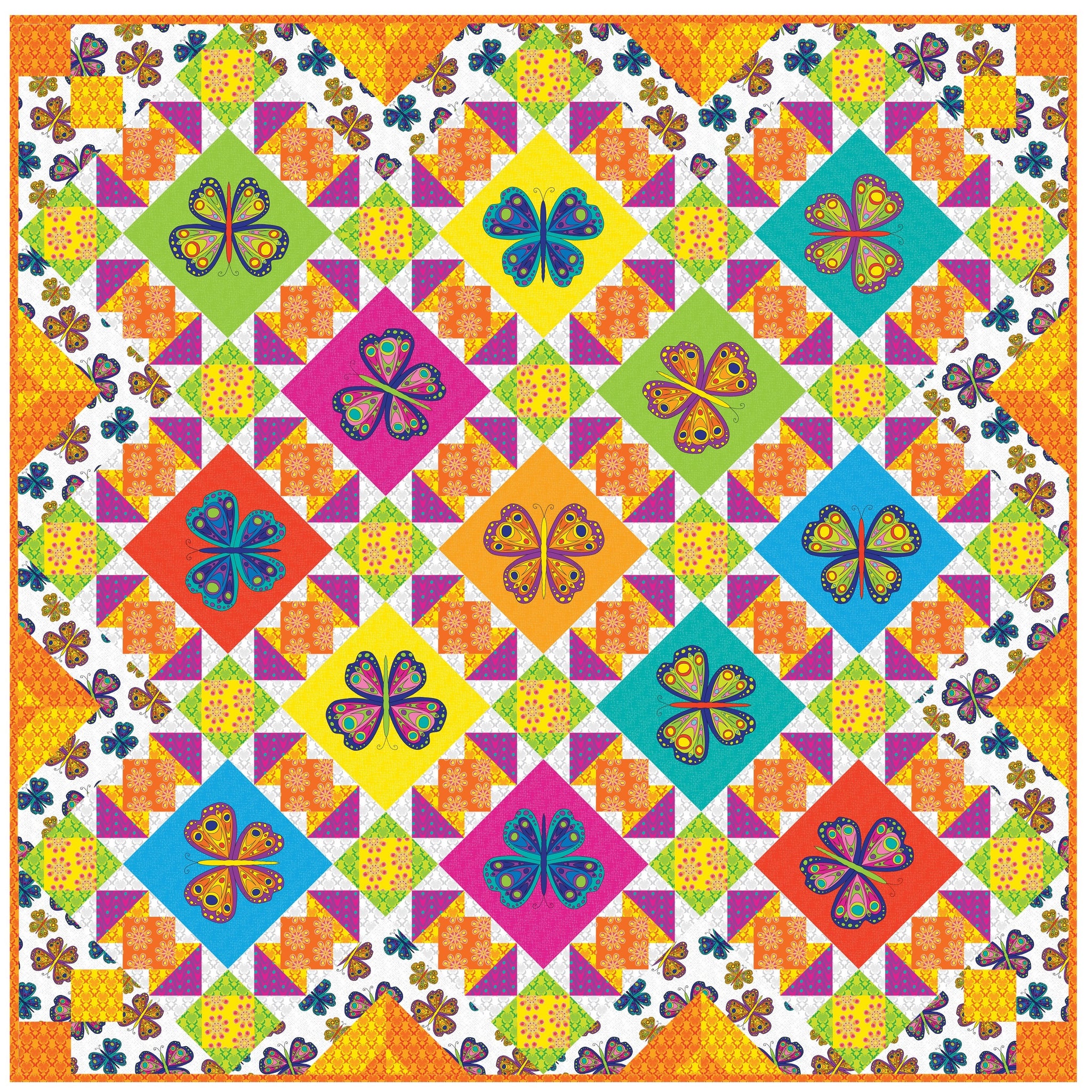 Cut up the beautiful butterfly boxes  and then with snowballed corners and border strip piecing, this quilt comes together so easy!  It looks more complicated than it is!