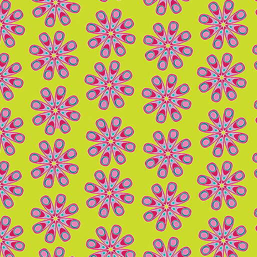 Multi 'kaleidoscope' pinwheels on a bright lime green background. Sku: Kaleidoscope 16829-44