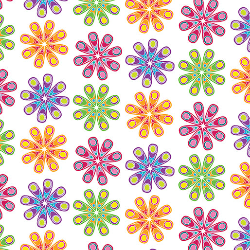 Multi 'kaleidoscope' pinwheels on a white thatched background. Sku: Kaleidoscope 16829-09